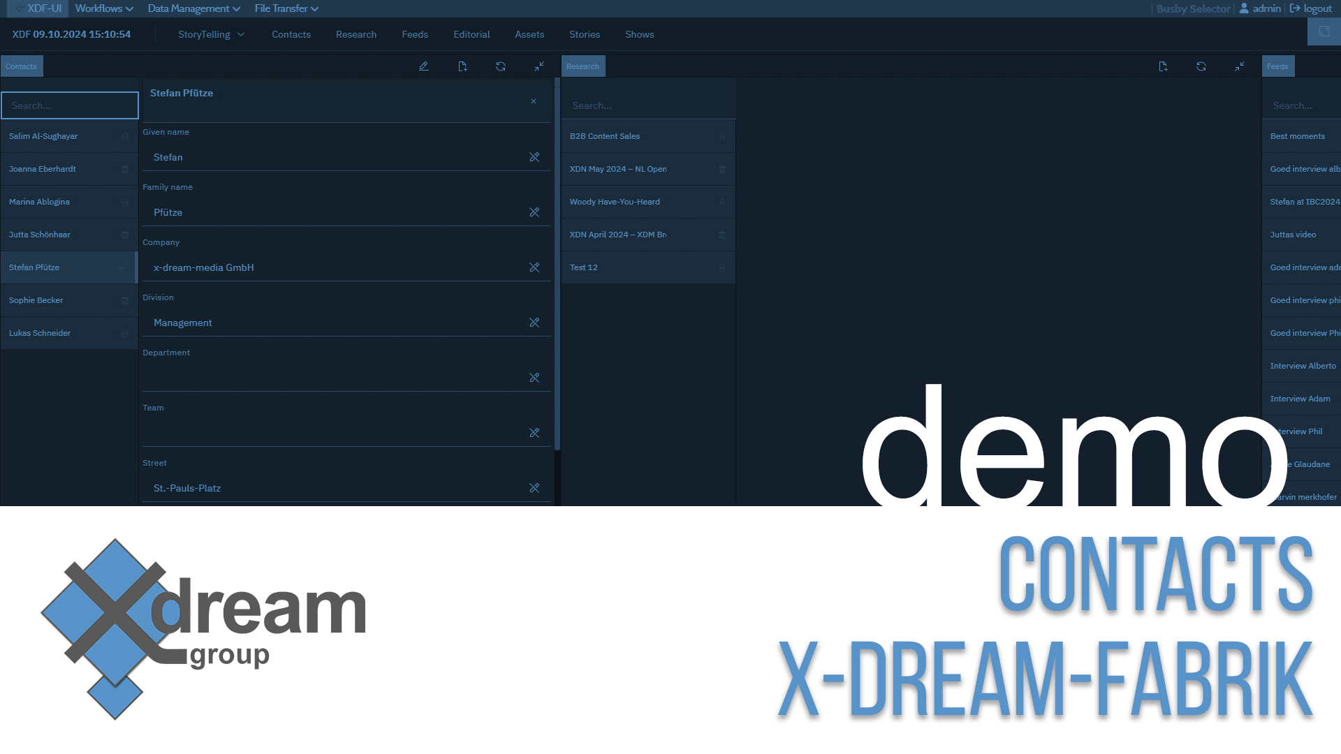 x-dream-Fabrik is a pre-integrated, pre-configured and managed end-to-end solution for the media industry. Thanks to its unique UI and microservices architecture it covers the complete business process from content production to post-production, asset management, story creation to playout, publishing, sales and distribution. x-dream-Fabrik is a ready-to-go platform with a clear licensing model. It runs on-premises, in public or private clouds or hybrid.