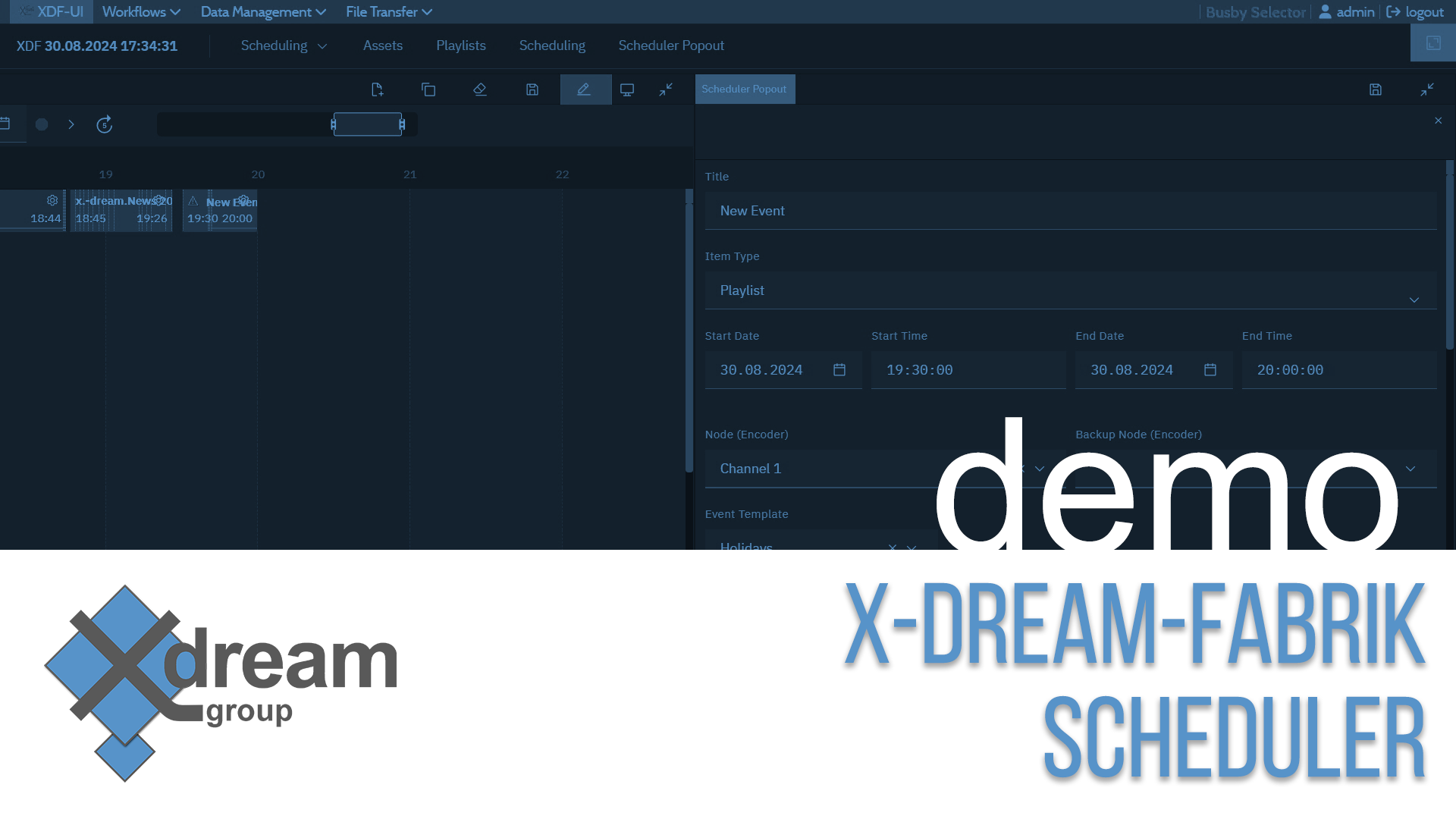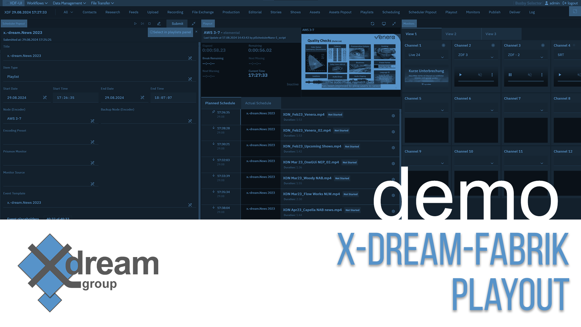 PLAYOUT consists from the x-dream-Fabrik modules Upload, Archive, Schedule, Playout and Monitor. It can be combined with all source modules like Record, Ingest, File Exchange, with the post-production product PRODUCE, with the media management product ARCHIVE, and with the output products like PUBLISH and DELIVER.
