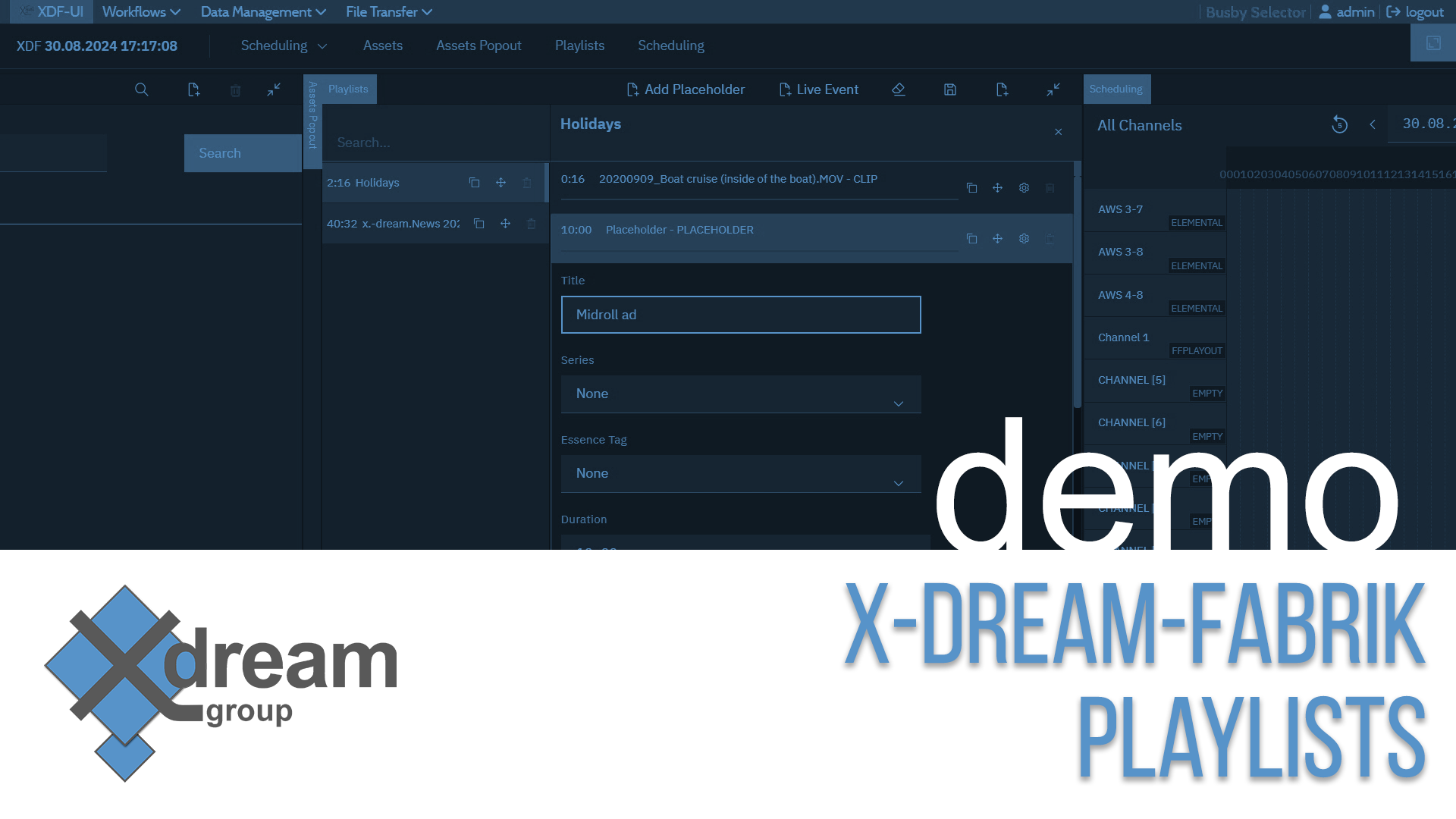 PLAYOUT consists from the x-dream-Fabrik modules Upload, Archive, Schedule, Playout and Monitor. It can be combined with all source modules like Record, Ingest, File Exchange, with the post-production product PRODUCE, with the media management product ARCHIVE, and with the output products like PUBLISH and DELIVER.